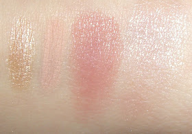 Die erste Highlighterfarbe wirkt hier sehr gold, ist aber eher ein Champagnerton, die restlichen Farben sind gut getroffen. Bei dem Lipgloss Duo ist eine Farbe sehr sheer und ähnelt einem Perlglanz-Labello, dafür finde ich die andere Farbe umso gelungener, da sie eine perfekte my lips but better Farbe für mich ist :)